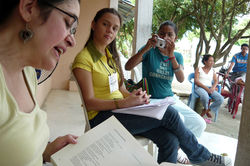 ![]() Luz Eugenia Sierra lee las notas literaria e histórica al poema “La noción del mantero”, de Beatriz Vanegas, en el barrio Venus de Cereté, el 27 de noviembre de 2010. |
