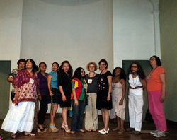 ![]() Alba Lucía Hernández, Margarita Galindo, Jaet Garibaldi (México), Margarita Vélez, Luz Eugenia Sierra, Stanka Frastelj (Eslovenia), Ana Ristovic (Serbia), AlmaSilgado, Mery Yolanda Sánchez y Angelina Llongueras (España) en sesión de grupo, antes de inaugurar el XVII Encuentro Nacional e Internacional de Mujeres Poetas, en el Centro Cultural Raúl Gómez Jattin, Cereté (Córdoba), el 25 de noviembre de 2010. |