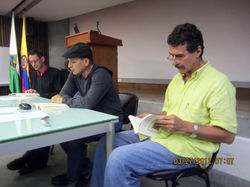![]() Pedro Arturo Estrada da lectura a su país imaginado, lo escucha Robinson Quintero Ossa. |