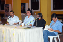 ![]() En los extremos Joaquín Mattos Omar y Robinson Quintero Ossa, quienes hacen lectura de una conferencia al alimón sobre el libro Colombia en la poesía colombiana: los poemas cuentan la historia. En el centro, Miguel Iriarte y Aníbal Tobón (directores del III Festival Internacional de Poesía PoeMaRio). |